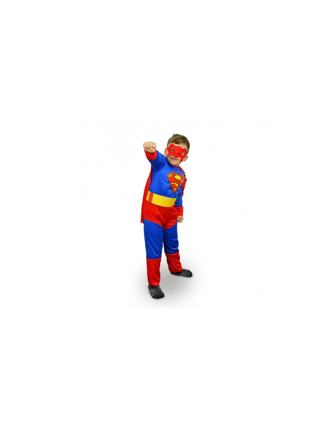 Il se compose d'un costume rouge et bleu avec de faux muscles, une cape rouge, une ceinture et un masque.