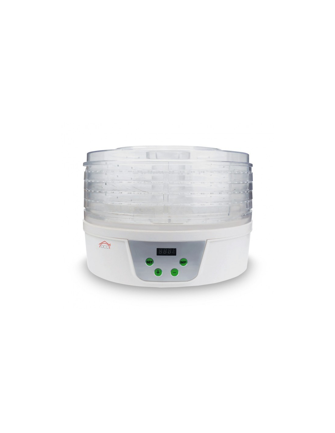 Il vous permet de sécher et de conserver les fruits et légumes tout en conservant leur goût et leurs propriétés nutritionnelles. A l'intérieur il y a un système de ventilation qui assure une répartition uniforme de la chaleur à tous les plateeaux. Bouton marche / arrêt, avec 5 plateaux réglables et amovibles, et un bac de collecte d'eau. Avec un design classique de tour, avec le moteur dans la base ronde, en plastique blanc, et cinq plateaux en plastique transparent empilés sur le dessus de celui-ci. Sur le devant, vous trouverez le bouton d'alimentation avec un voyant lumineux et le bouton de commande du thermostat, de 35 à 70 ° C