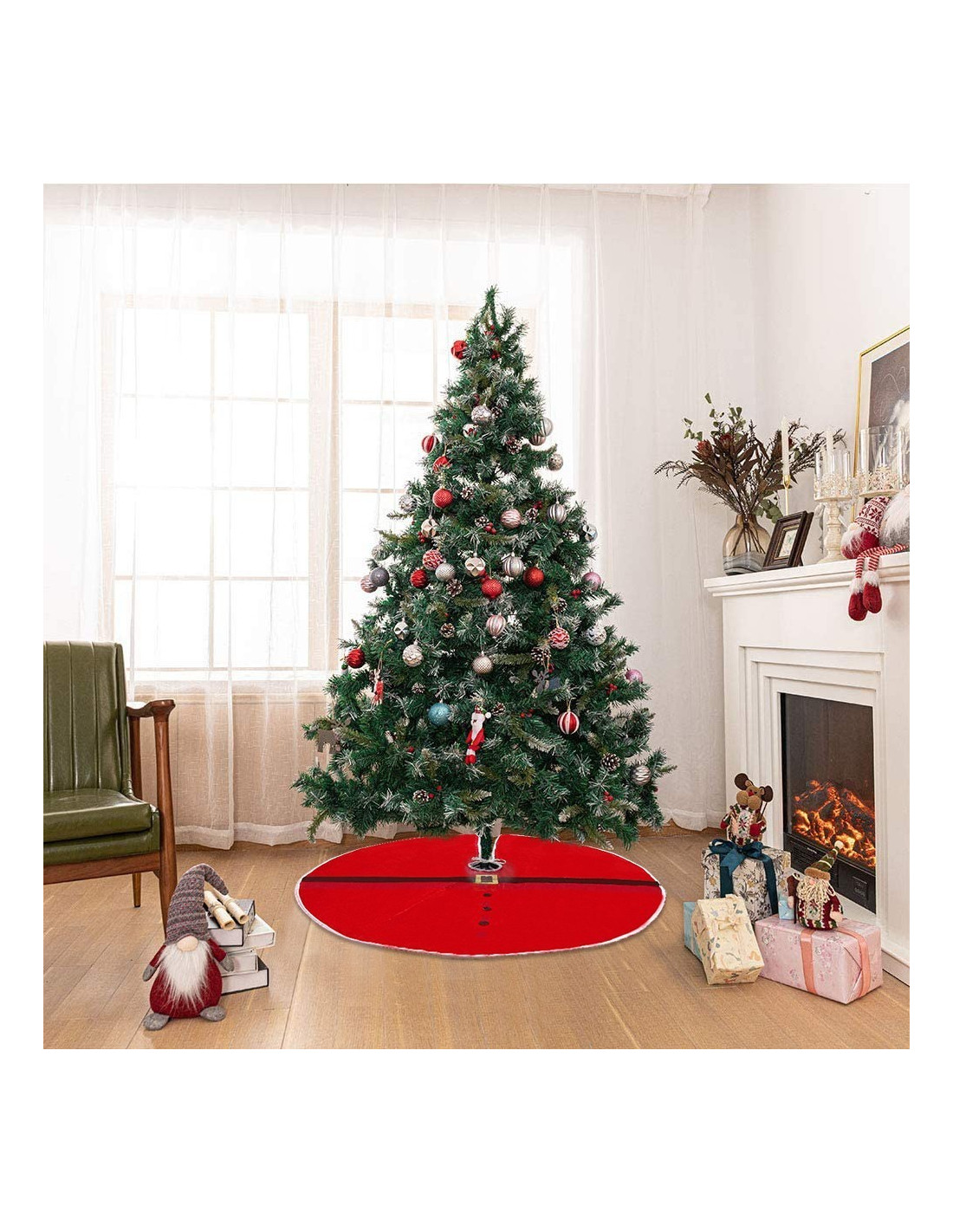 Ce tapis en polyester à dominante rouge reproduit la tenue classique portée par le Père Noël. Sa couverture douce recouvrira la partie métallique de la base pour servir de fond à d'autres décorations que vous pourrez également placer sur le sol ... Cela rendra l'atmosphère encore plus chaleureuse, plus cosy et plus accueillante !