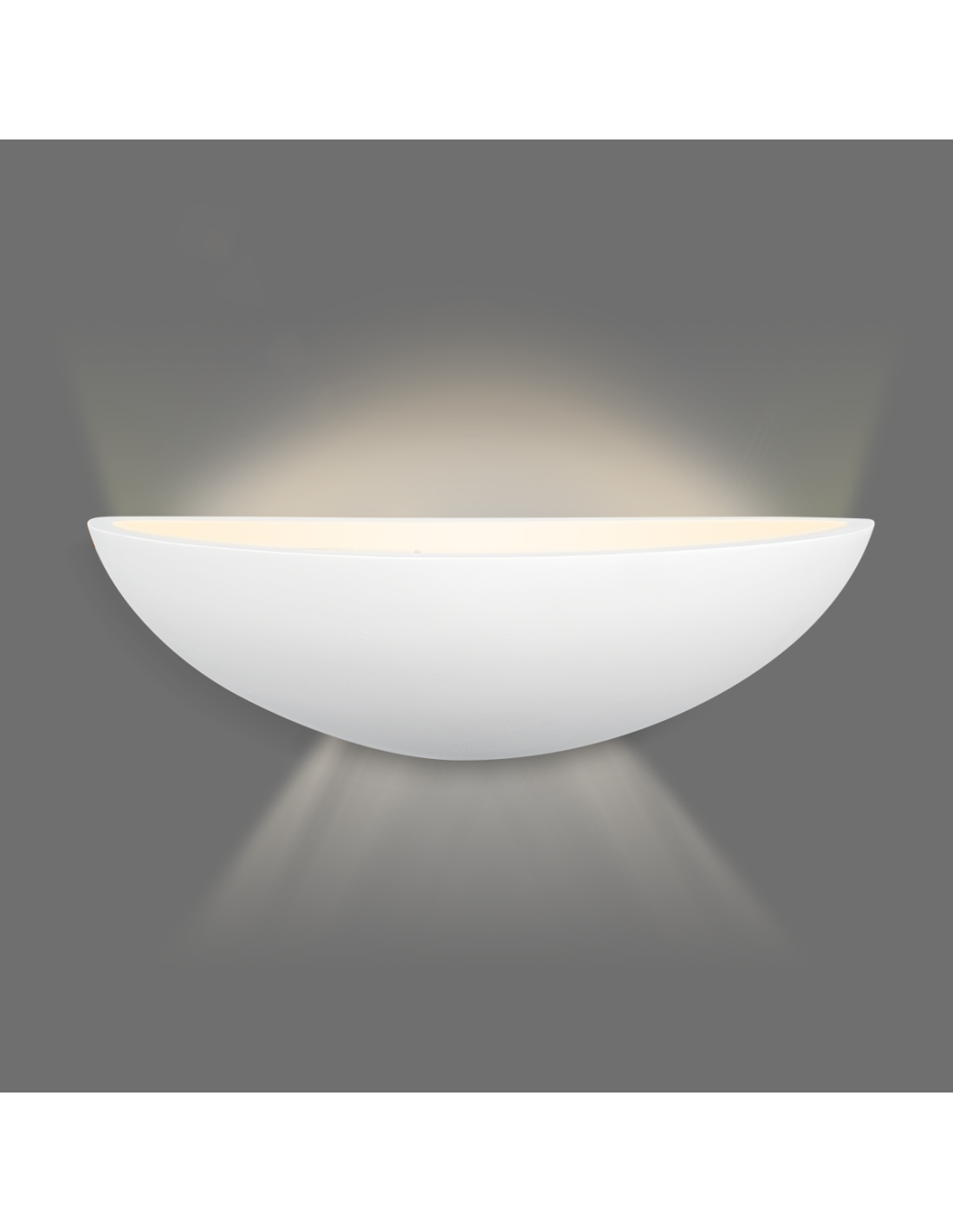 Applique murale en plâtre élégante, design croissant adaptée aux intérieurs. Il a une double émission, un éclairage zénithal de 145° et se caractérise par une fente en bas qui laisse passer un petit faisceau de lumière indirecte de 125°. Extrêmement décoratif et polyvalent, vous pourrez le peindre, le décorer et le personnaliser avec les couleurs que vous souhaitez et selon votre décoration. Une fois installés au mur, ils garantissent un excellent effet d'éclairage, créant des effets de lumière parfaits grâce aux trous dans les parois de la lampe. Le matériau extérieur de la lampe est en plâtre durable et facile à nettoyer. Équipé d'une douille E27, vous pouvez insérer des ampoules Led, fluorescentes ou halogènes (ampoule NON incluse). L'installation est simple, vous pouvez vous aider avec les instructions sur la boîte.