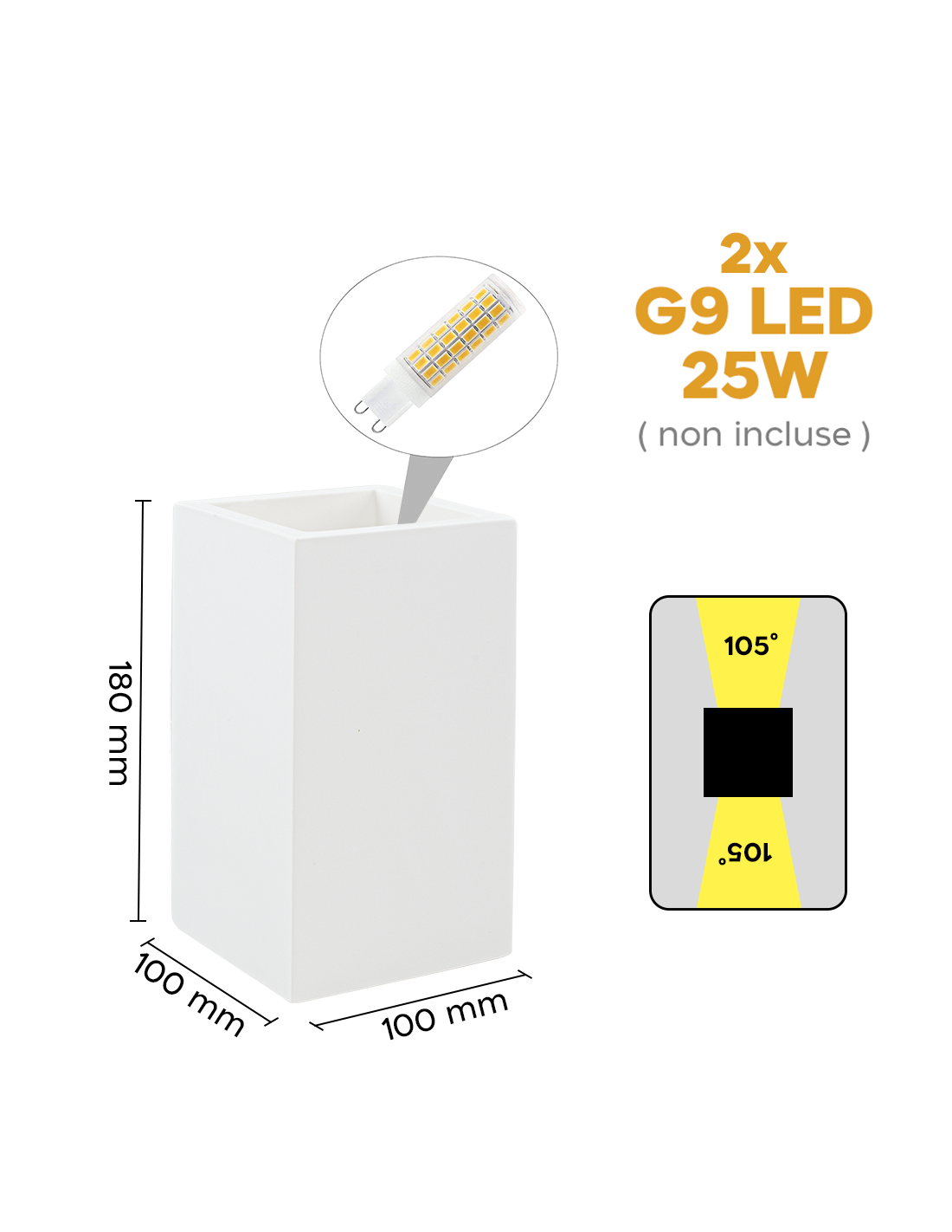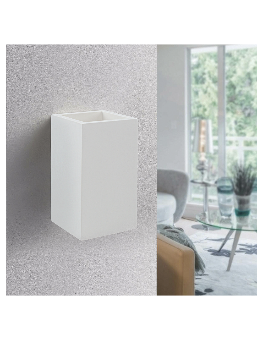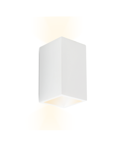 Applique murale en plâtre élégante, design adapté aux intérieurs avec un design de cube rectangulaire. Il a une double émission, la lumière sort à la fois au-dessus et au-dessous. Extrêmement décoratif et polyvalent, vous pourrez le peindre, le décorer et le personnaliser avec les couleurs que vous souhaitez et selon votre décoration. Une fois installés au mur, ils garantissent un excellent effet d'éclairage, créant des effets de lumière parfaits.
