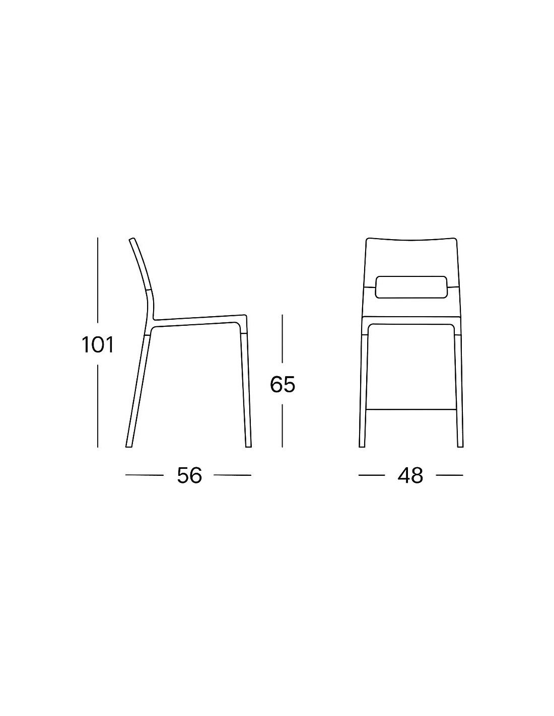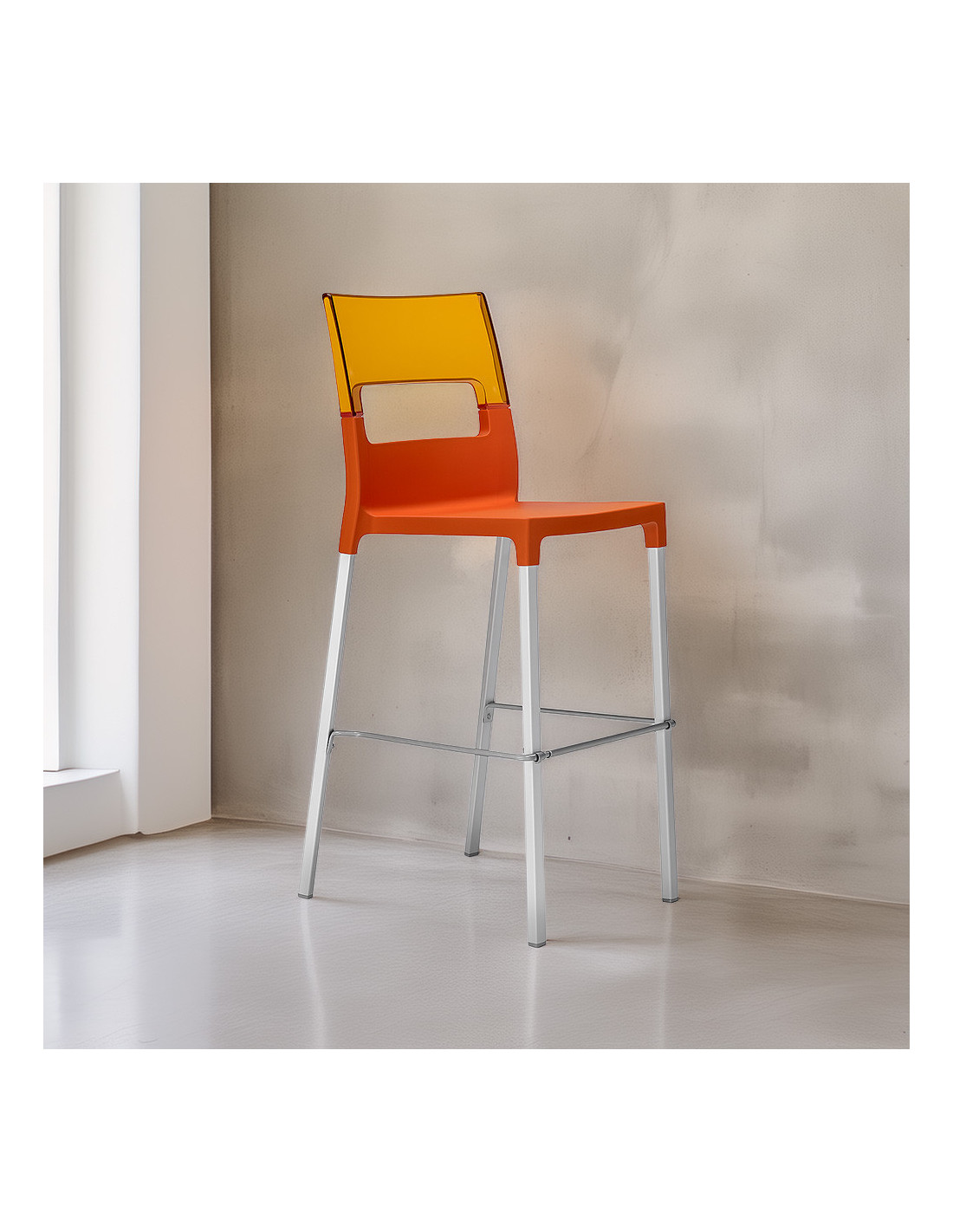 L'assise est fabriquée en technopolymère recyclable renforcé de fibre de verre, un matériau synonyme de solidité, de résistance à l'usure et de durabilité. Le dossier en polycarbonate transparent apporte une touche de légèreté visuelle, rendant le tabouret moderne et attrayant.
