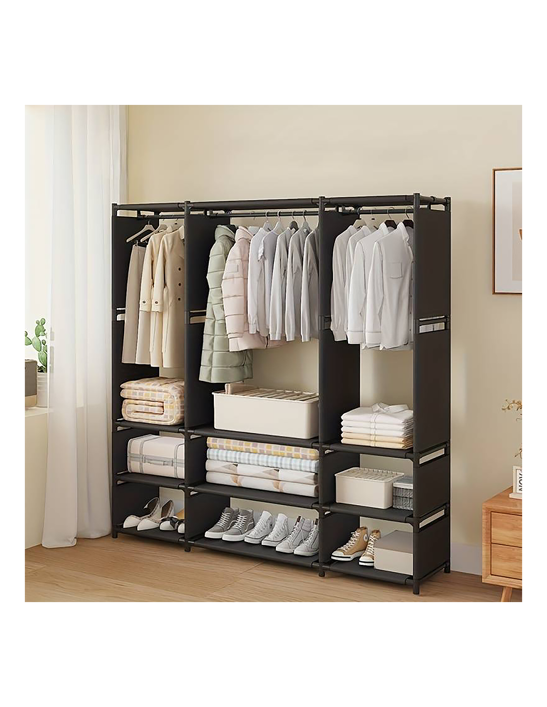 Idéal pour optimiser l'espace et garder vos vêtements en ordre, ce garde-robe en tissu est parfait pour ceux qui recherchent une solution gain de place et pratique. Construit avec une structure en acier robuste et des connecteurs en plastique PP, il garantit stabilité et durabilité. Avec 9 étagères en tissu fonctionnel et 3 compartiments avec barres de penderie, il offre un large espace pour organiser vos vêtements. La couverture en tissu non tissé sur les côtés protège vos vêtements de la poussière, les maintenant frais et ordonnés.