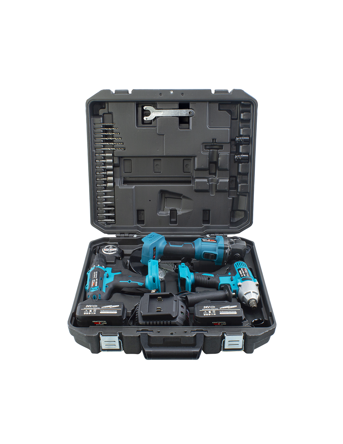 Le forfait comprend : une perceuse, une meuleuse et un tournevis. Les outils sont sans fil, disposent de puissantes batteries 24V et d'un chargeur. La perceuse-visseuse sans fil a un design très léger et compact qui est parfait pour les opérations de vissage et de perçage. La poignée est caoutchoutée pour une utilisation confortable. Pendant ce temps, la meuleuse est destinée à : polir, couper, meuler et convient pour enlever la rouille.
