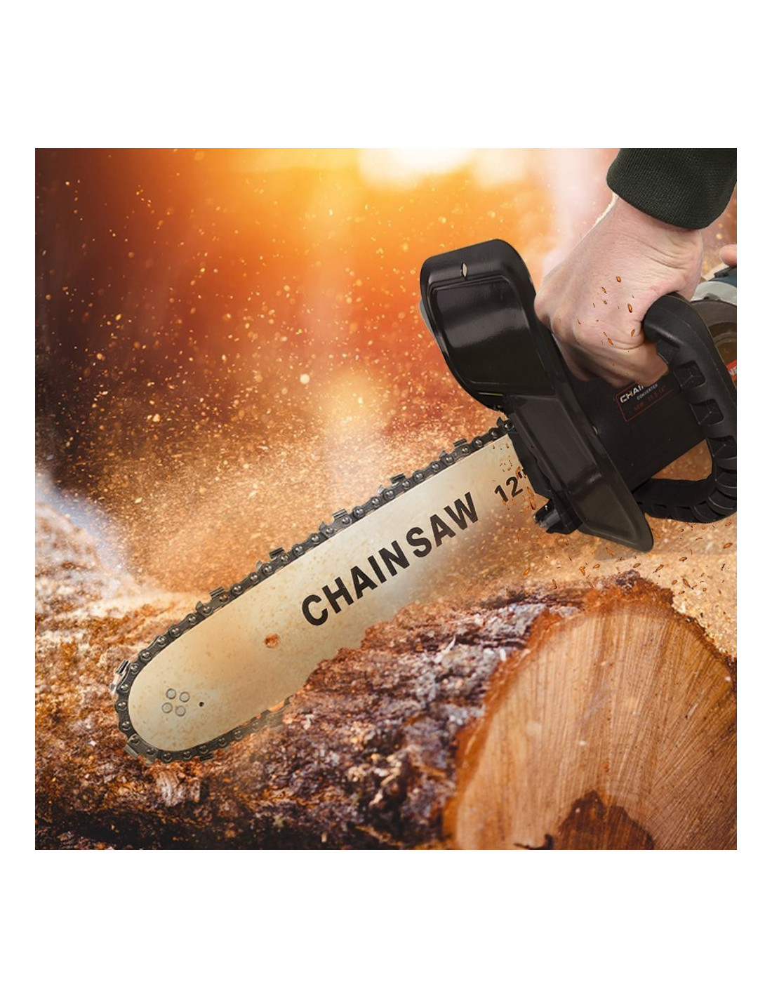 Kit adaptateur de broyeur, lame et pièces de rechange pour tronçonneuse avec lame de 12 ''. La chaîne est à haute température, difficile à casser et ç'est possible de l'utiliser pendant une longue période. Avec ces accessoires, votre meuleuse d'angle deviendra une tronçonneuse pour couper les branches, le bois et le bambou. Le kit comprend: une lame et une barre de tronçonneuse de rechange faciles à installer en alliage métallique.