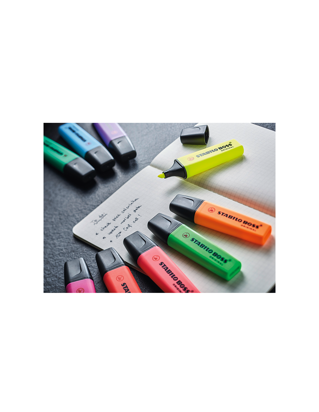 Depuis 1971, le STABILO BOSS ORIGINAL est le surligneur préféré des étudiants et des travailleurs, parfait pour mettre en évidence les informations essentielles à l'école, à l'université ou au bureau. Grâce à la technologie anti-dessèchement STABILO, le STABILO BOSS ORIGINAL peut rester sans capuchon pendant jusqu'à 4 heures sans que l'encre ne sèche. Encre à base d'eau et double épaisseur de trait de 2 + 5 mm. Il peut être rechargé après une utilisation intensive. Édition spéciale pour le 50e anniversaire du STABILO BOSS ORIGINAL, un ensemble de toutes les 23 couleurs : 14 couleurs pastel et 9 fluorescentes sur une base d'exposition en plastique recyclé à 100 %.