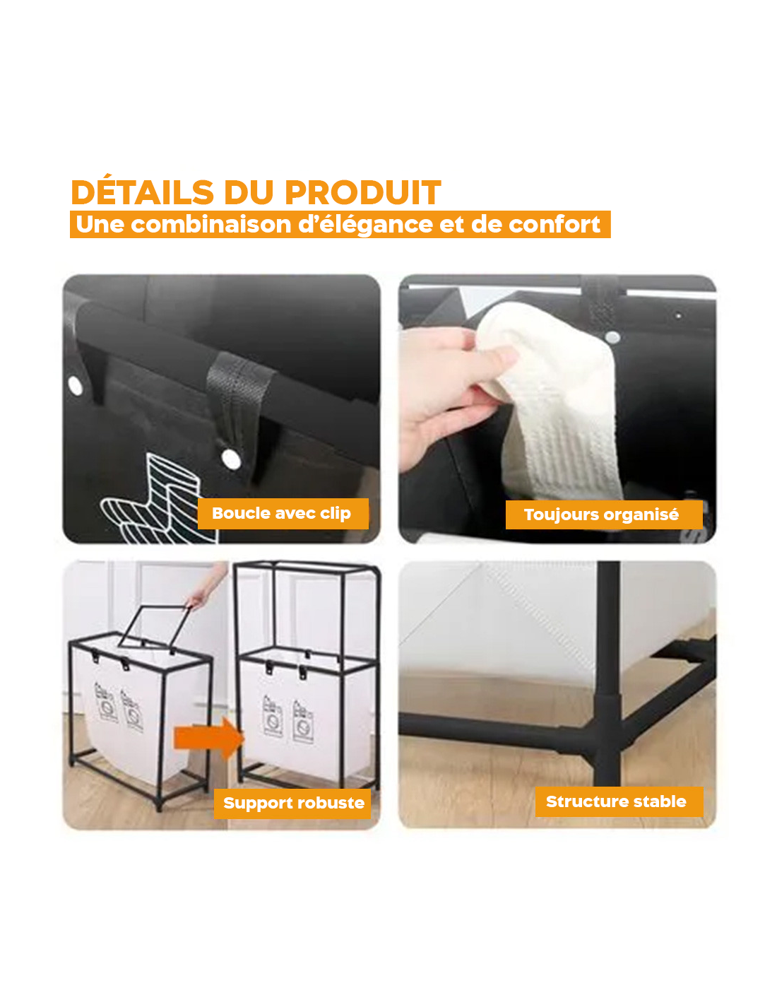 ● ACIER RENFORCÉ : cadre construit avec des tubes épaissis pour offrir plus de robustesse et supporter le poids du linge.