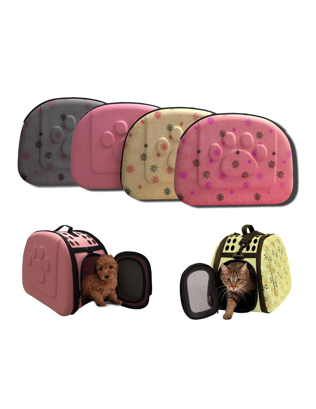 Convient à apporter de petits chiens, chats et rongeurs, idéal pour la visite chez le vétérinaire, pour les trajets en voiture ou couchette qui peut servir pour la maison. Les finitions de cette cage sont particulièrement original, grâce à la forme de patte levée sur les deux côtés. La porte d'entrée est constitué d'une grille qui permet à l'animal pour voir ce qui se passe à l'extérieur, tandis que le côté est entièrement perforée pour une bonne respiration. Le toit dispose d'une poignée pratique qui facilite le transport et est équipé de deux anneaux de métal à laquelle vous pouvez attacher la sangle d'épaule inclus. Tout est contenu dans un petit sac qui se transforment par magie en cage parfaite pour vos chiots.