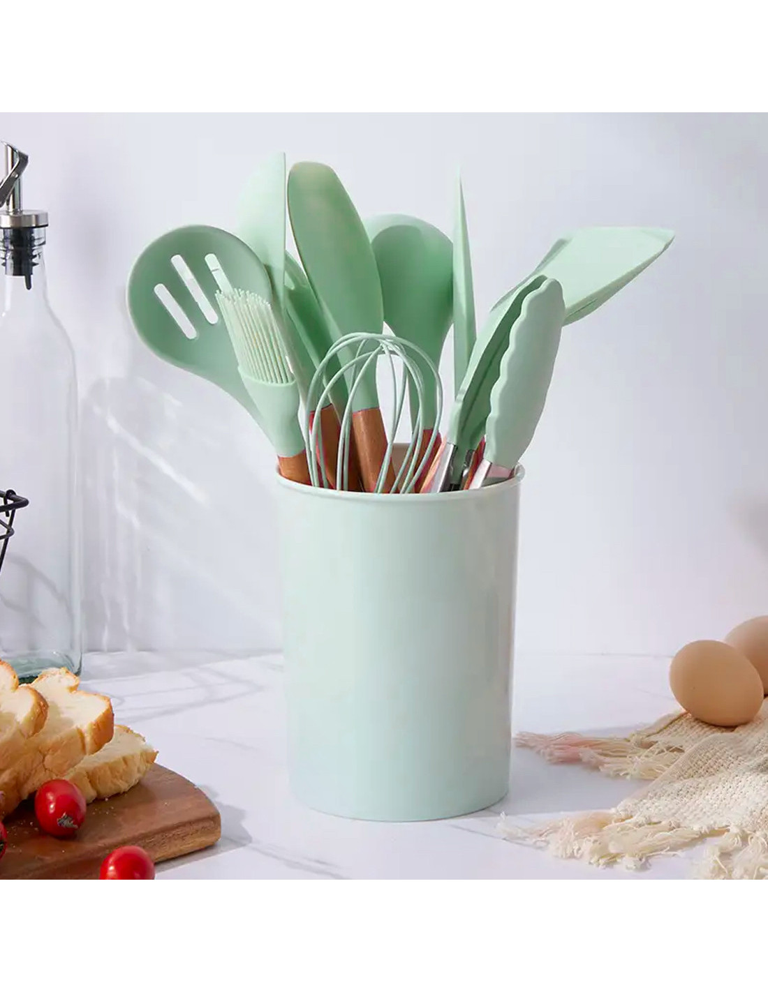 Ce porte-ustensiles a une capacité généreuse pour accueillir une variété d'ustensiles de cuisine, garantissant qu'ils sont toujours à portée de main lors de la préparation des repas. Il est également sûr au contact des aliments, facile à nettoyer et adapté à une utilisation en cuisine à une large gamme de températures. L'ensemble comprend tout ce dont vous avez besoin pour la cuisine : une écumoire, une cuillère, une cuillère à spaghetti, une louche, une spatule à fentes, une spatule pleine, des spatules en silicone, des pinceaux en silicone, un fouet à œufs, des pinces de cuisine.