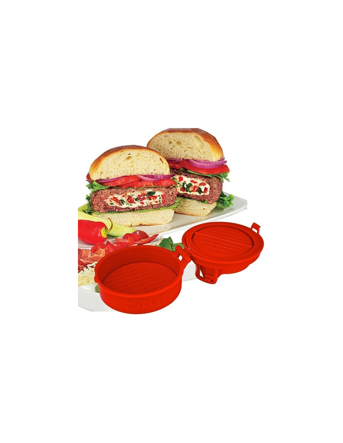 Fácil de utilizar. Abra su Stufz e introduzca la carne molida. Cierre la prensa haciendo una buena presión. La apertura de la prensa se dará cuenta de que su carne se habrá añadido previamente. Ahora añadir sus ingredientes favoritos, tales como cebolla, queso, hierbas, chile, ajo, champiñones, y mucho más....dentro de la cavidad. En el otro extremo, añadir la carne picada y finalmente cerrar su prensa para sellar los bordes perfectamente, ejerciendo presión.